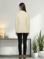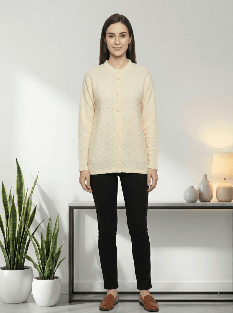 Lightweight cream textured cardigan with button-front design for office and casual layering.