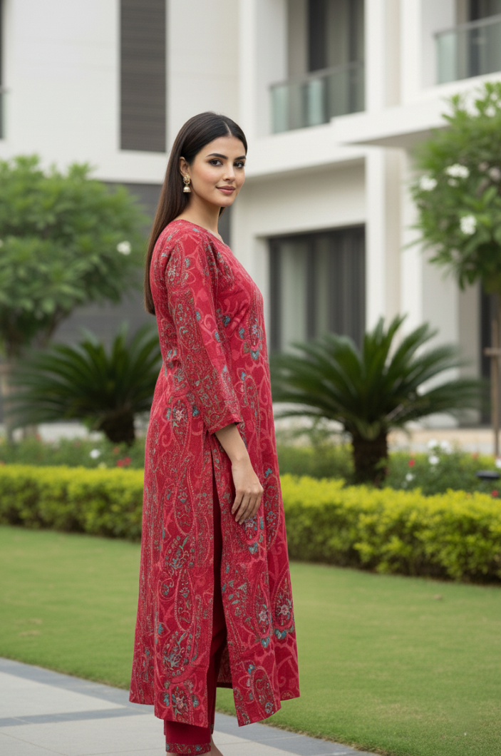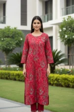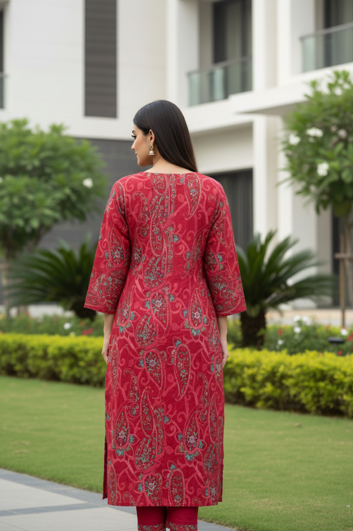 Bold crimson paisley-print kurta set with long straight silhouette and matching trousers.