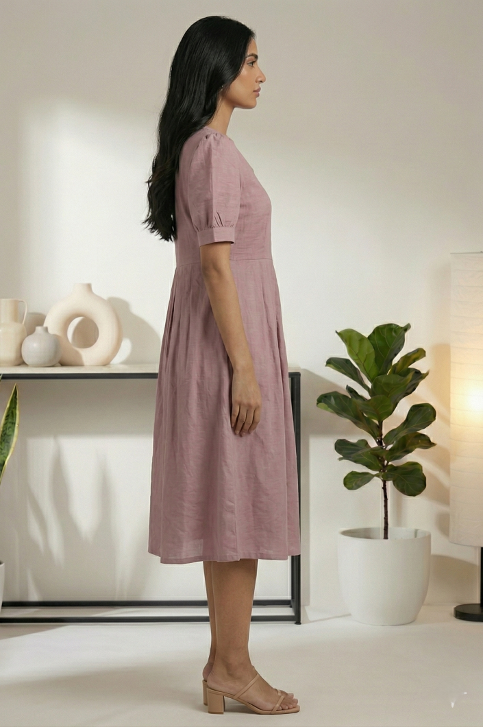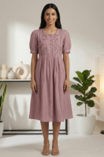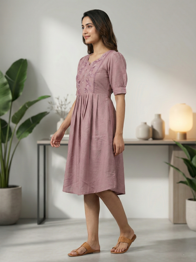 Dusty rose pleated tunic dress with delicate embroidery and puff sleeves for everyday and casual wear.