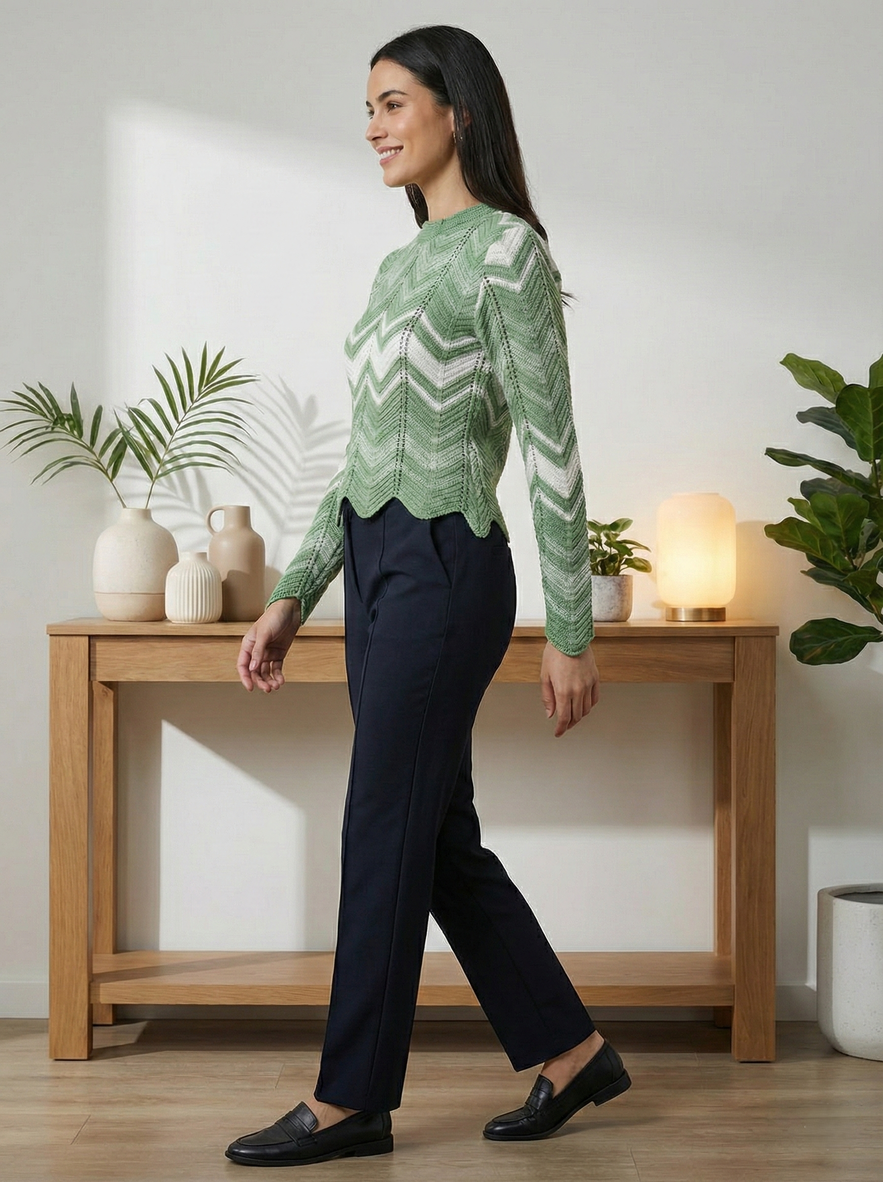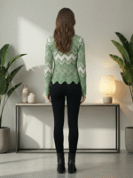 Chevron-pattern knit pullover with scalloped hem for smart-casual winter styling.