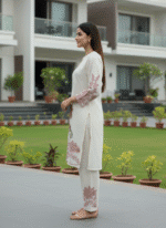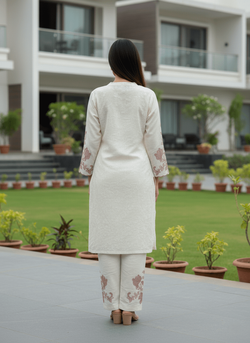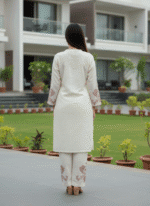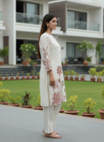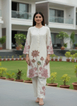 Ivory kurta set with large lotus embroidery for a bold, artistic ethnic statement.
