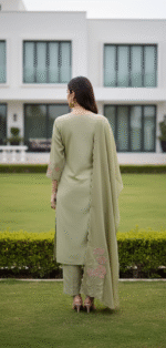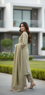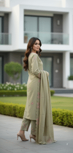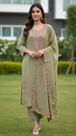 Olive green embroidered kurta set with matching pants and dupatta for festive and semi-occasion wear.