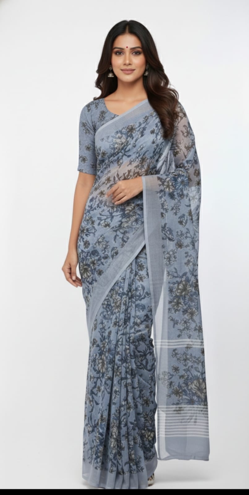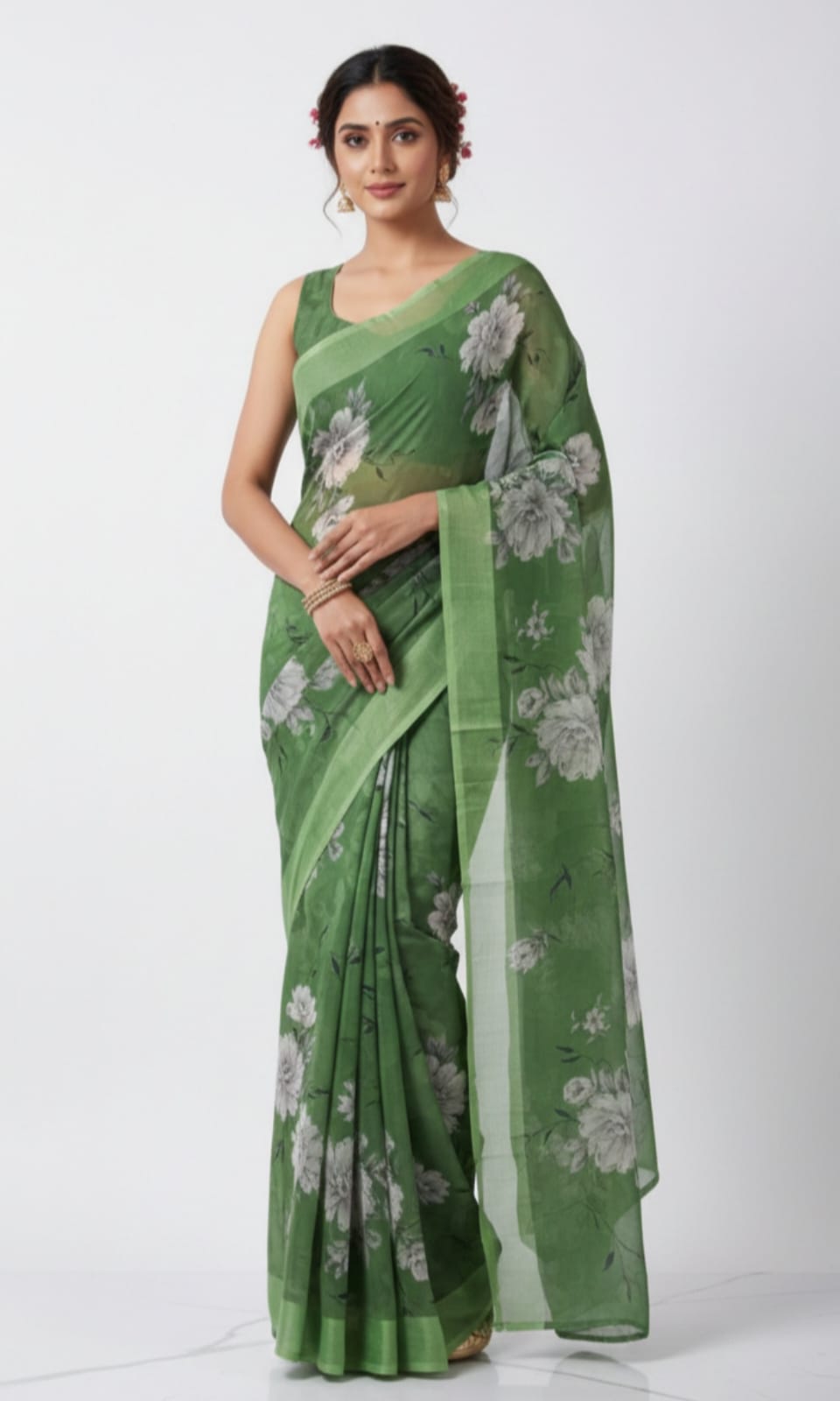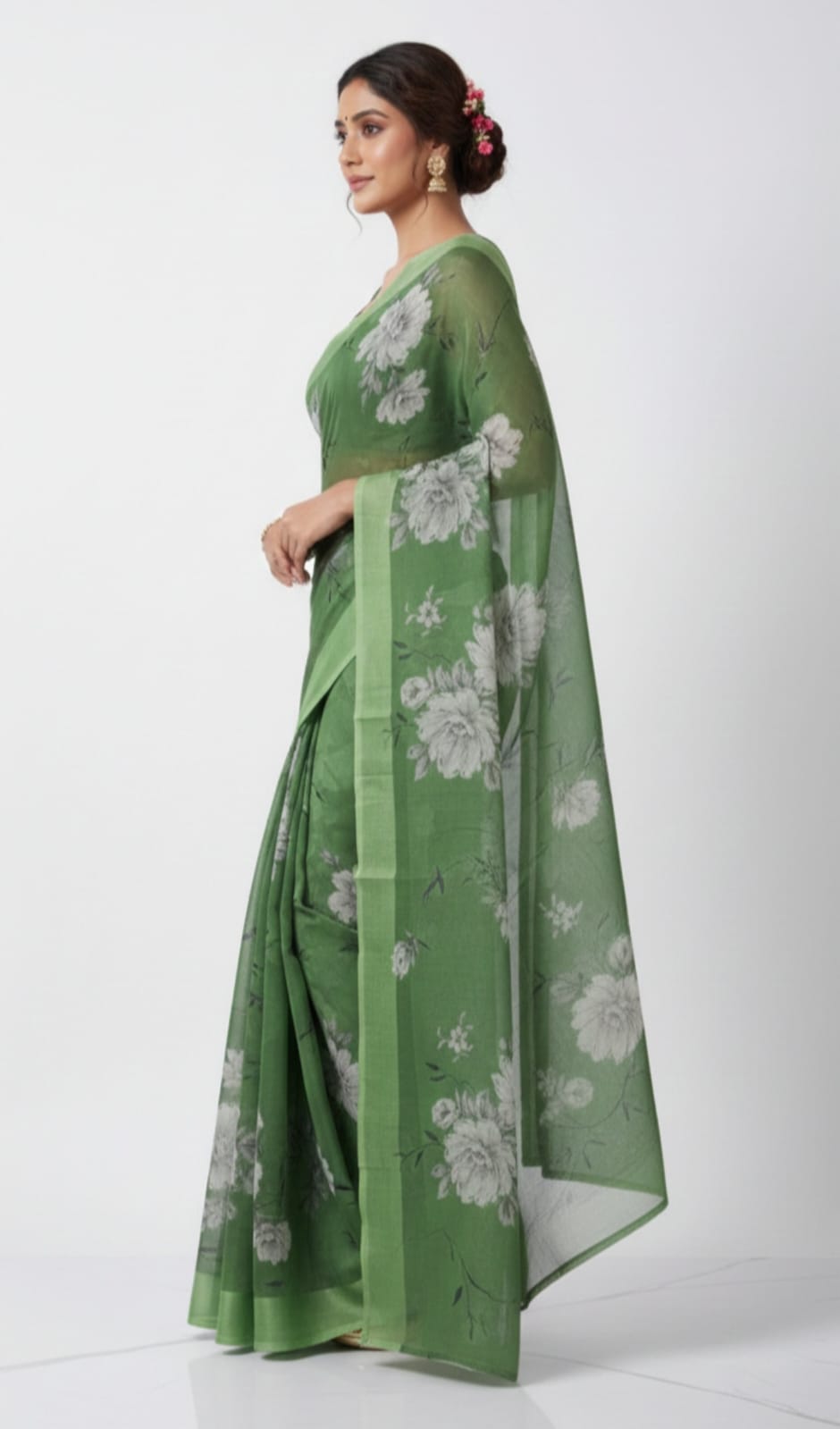 Olive green floral printed saree