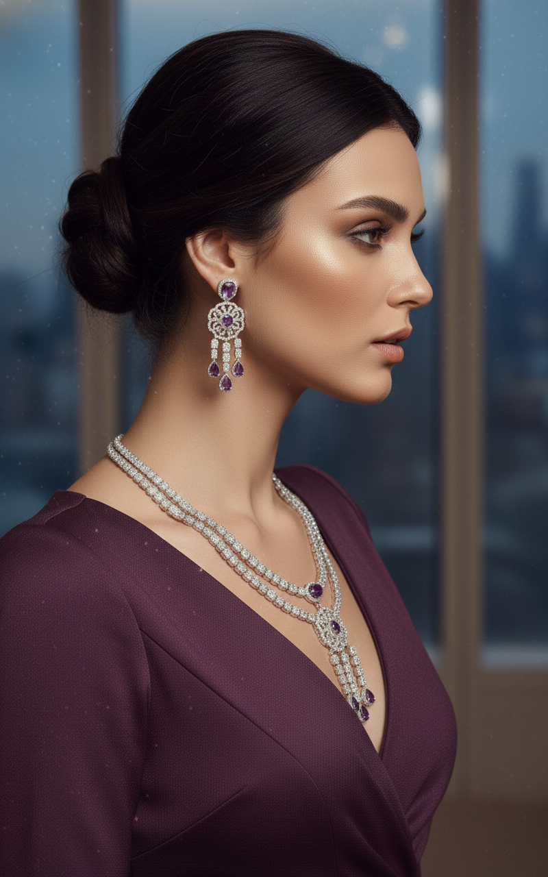 Rhodium-plated necklace and chandelier earrings set with amethyst-colored stones and premium CZ sparkle.