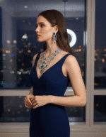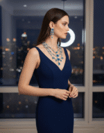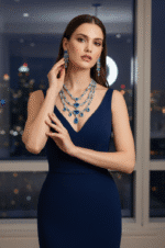 Triple-layer rhodium-plated necklace set with ice-blue stones and premium CZ crystals for high-end evening wear.