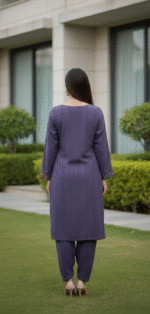Slate blue straight kurta set with subtle floral embroidery and matching pants for daily and office wear.